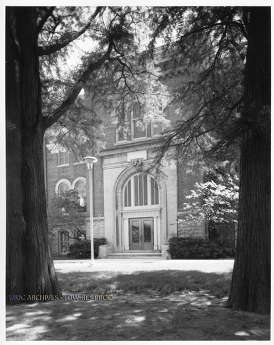View, between trees, of the north entrance to Harker Hall at the University of Illinois showing the detail of the entry portal.