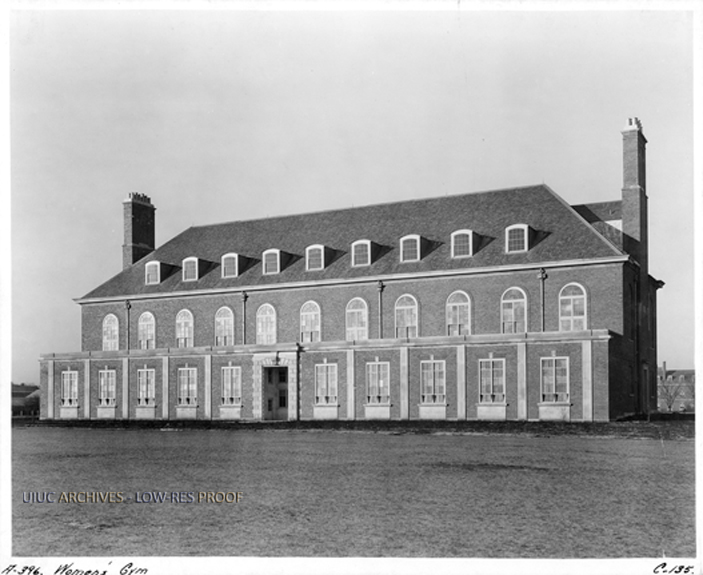 East facade of the Women's Gymnasium at the University of Illinois, later named Freer Hall. Note the unfinished landscaping around the building.