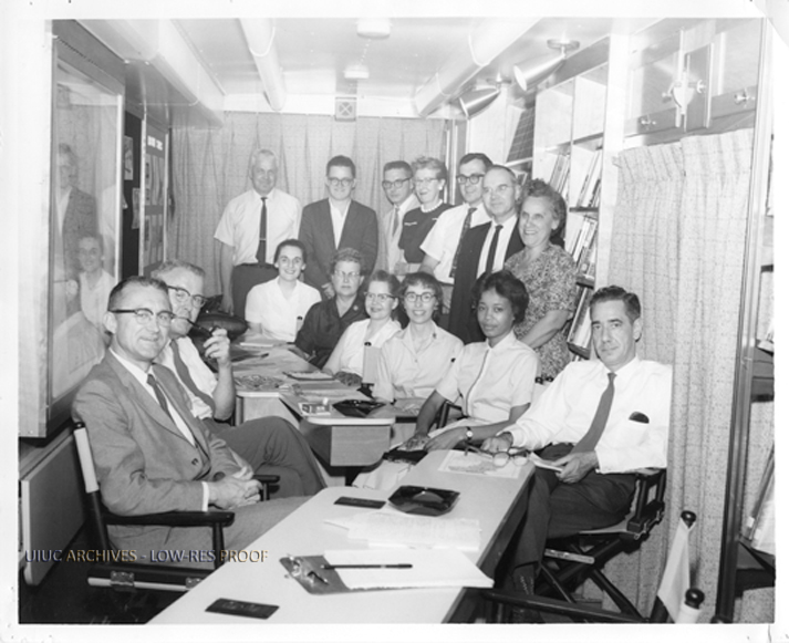 Library Science 434 class visiting the Illinois State Library's new "Library Laboratory." Seated, left to right: de Lafayette Reid, Asst. State Librarian; Prof. Donald E. Stout; Mrs. Margaret Rausch; Mrs. Sally Burg; Helen Zachman; Alice Norton; Mrs. Jessie C. Smith; J. C. Harrison. Standing, left to right: Harold Rath, of the State Library Staff; J. Curt Bohling; Robert E, Birkhimer; Helen Cummings; John E. Frey; Miller Boord, of the State Library Staff; Mrs. Laura L. Langston, of the State Library Staff. (Reid, Langston, Rath are all U of I Library Science grads.) Found in RS: 39/2/20, Box COL - 8 (1940-), Folder COL - 8 Library Sciences 1960-69.