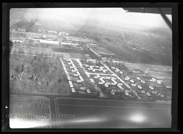 Aerial view, looking north, of the Illini Village temporary housing complex at the University of Illinois. Note the Mount Hope Cemetery to the left of Illini Village and the greenhouses, Freer Hall, and Busey and Evans Halls in the distance.