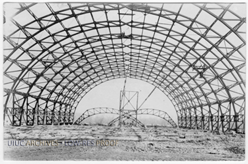 Construction of the Armory at the University of Illinois with the perspective of looking through the vault created by the steel frame.