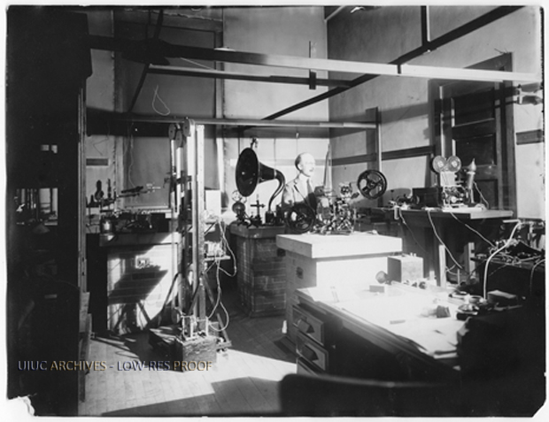 Caption back reads: "View of the laboratory at the Univ. of Illinois in Urbana, showing Prof. J.T. Tykociner and his talking motion picture apparatus spring 1922, when the talking film was demonstrated to President David Kinley and to the Board of Trustees. The first official demonstration took place in the laboratory November 1921."