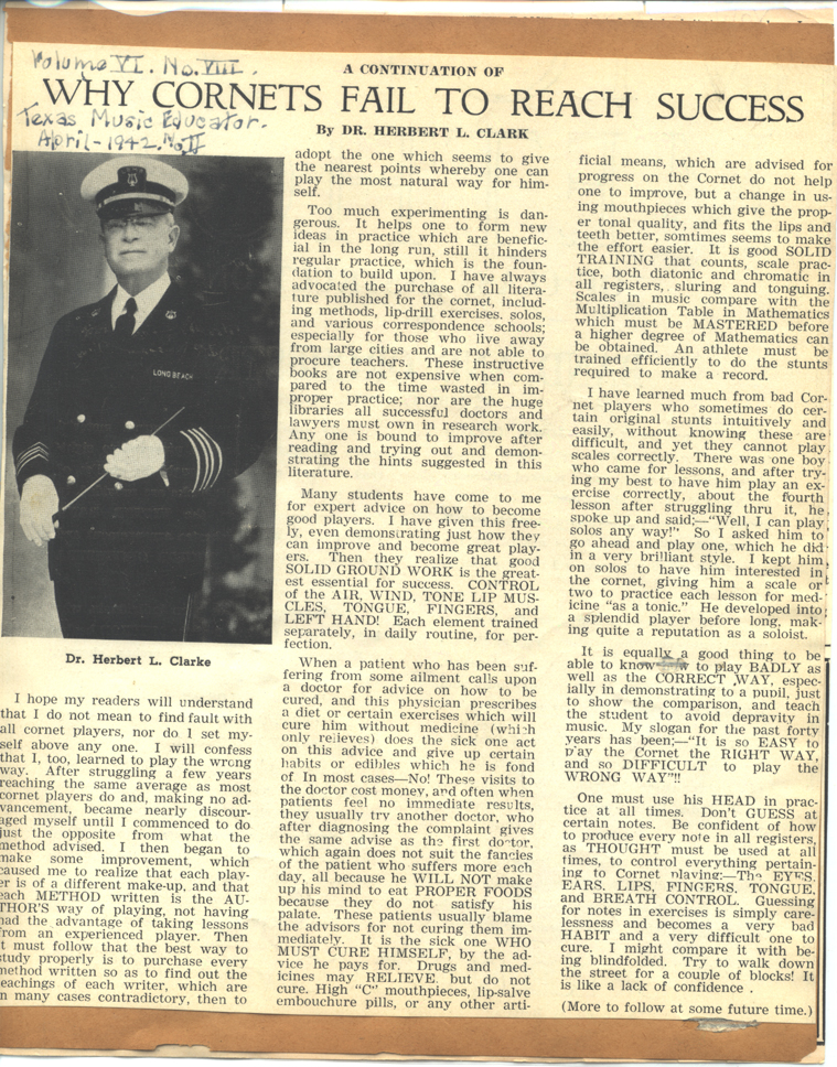 ScrapbookPage 5: Why Cornetists Fail to Reach Success, by Herbert L. Clarke in Texas Music Educator, No. 2, April 1942