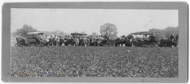 A group a farmers from Illinois, with horses and carts as well as a car, stands amid the University of Illinois Soil Experiment Field. On the reverse of the photo is a chart detailing the crop yields from the field for 1903 corn, 1904 oats and 1905 clover.