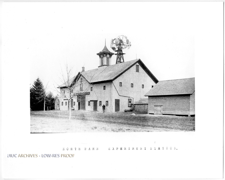 North barn of the experimental farm, viewed from the south west, showing the details of the south and west walls and the cupola, with a windmill visible behind the structure. This barn was located in the current vicinity of Mumford House, the farm residence at the time.