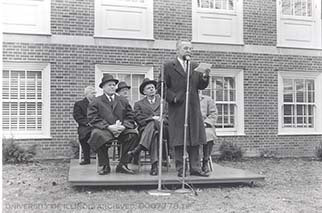 Professor Mark Hindsley, director of UI Bands, accepts the new $846,000 Band Building at dedication exercises held March 7, 1958. Others shown are Park Livingston, Governor Stratton, President DD Henry, Back right Fr. Arbedson, back left.