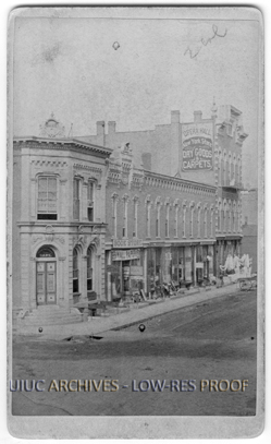 Several businesses in Champaign including First National Bank, a bookstore and wallpaper outfitter and Opera Hall / New York Store.