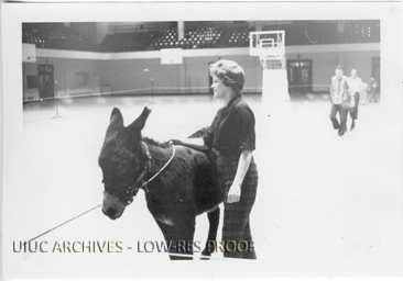 A young woman, awarded as the winner of the girls donkey ride contest, part of the Field and Furrow and Agriculture Educations club's Donkey Basketball game, stands next to a donkey.