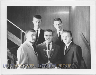 Caption accompanying photo reads, The [University of Illinois soil judging] team proudly displays the coveted first place trophy. Left to right they are: Dale Meyer, Steve Winter, Jerry Doll, coach Dr. B. R. Sabey, and Frank Zwijack.