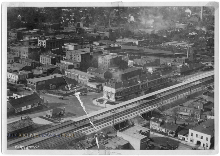 Aerial view, towards the northwest, of the downtown Champaign business district with the Illinois Central Railroad, the Illinois Central Terminal, and the businesses bounded by University Avenue, the Illinois Central Railroad, Washington Street, and Walnut Street visible.