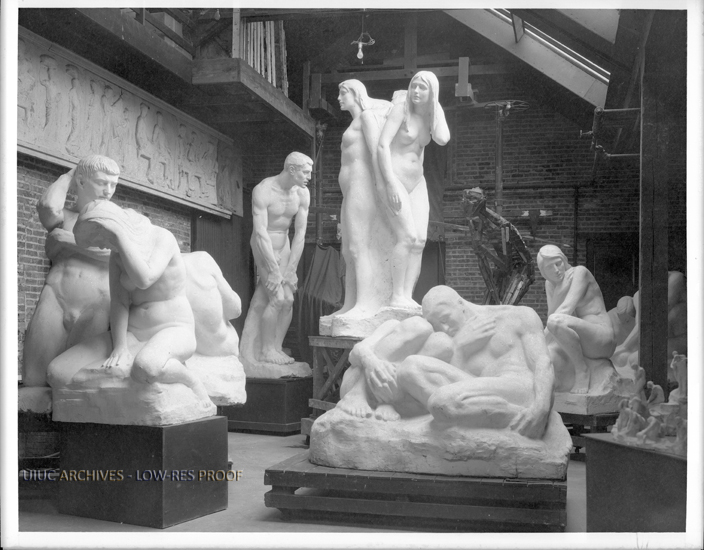 Figures from Lorado Taft's Fountain of Creation inside a studio.