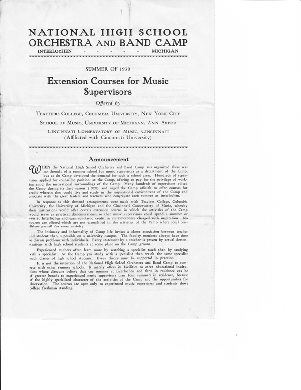 National High School Orchestra and Band Camp Pamphlet, Interlochen, Michigan (page 1) | The Sousa Archives and Center for American Music
