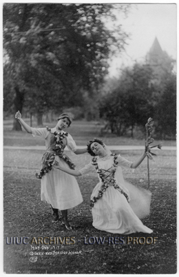 Two young women, the Queen and Maid of Honor of May Fete, on a lawn with the Library Building, later renamed Altgeld Hall, visible in the background.