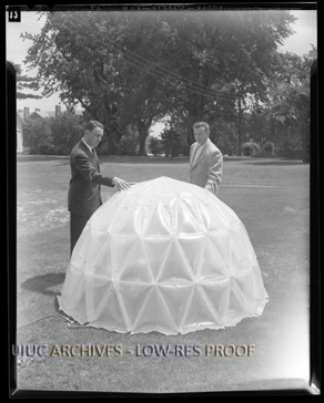 Caption accomanying photo reads, "Prof. Ambrose C. [sic] Richardson (left) and Maj. George W. McCauley, AF [Air Force], with demonstration dome of 'pneumatic bricks.'"