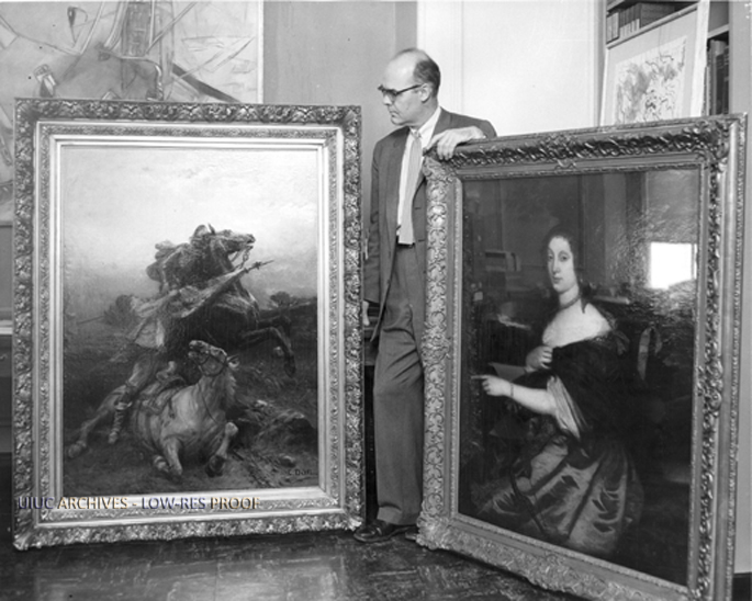 Caption on back: Dean Allen S. Weller of the University of Illinois College of Fine and Applied Arts examines two paintings given by Dr. Karl A. Meyer of Chicago to the University's permanent art collection. At left is a painting by 19th Century Italian artist, Cesare Detti. The second painting is a 17th Century English portrait, identified only as belonging to the "School of Lely." Dr. Moyer, surgeon and medical superintendent of Cook County Hopital, is an Illinois alumnus and a former president of the University's Board of Trustees.