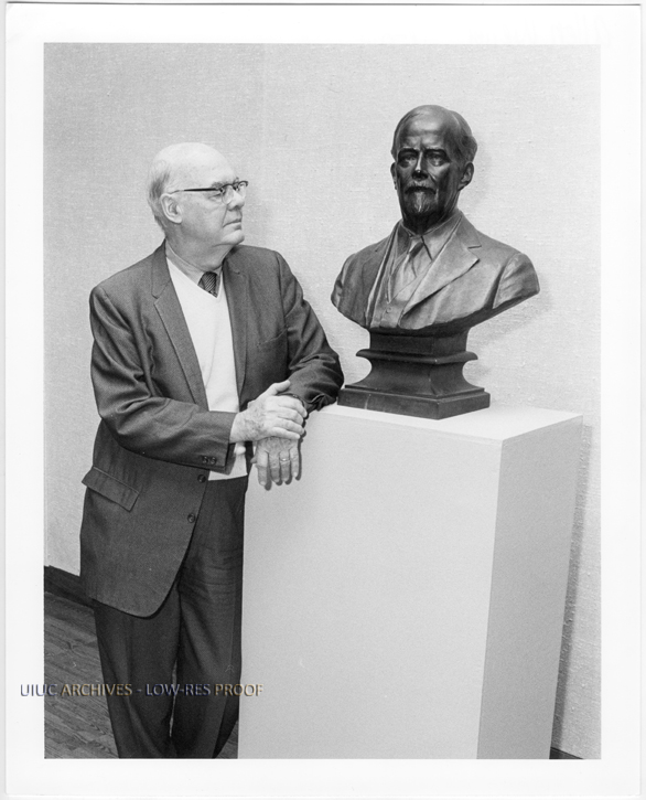 Allen Weller, professor of History of Art (1947-97) and Dean of Fine and Applied Arts (1954-71) stands next to a bust of Lorado Taft, University Alum (B.L. 1879, M.L. 1880) and one subject of Prof. Weller's studies.
