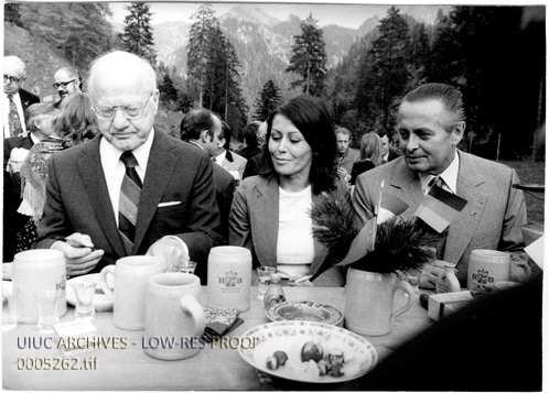 Avery Brundage attends Press Party near Munich prior to the Summer Olympics Games. Brundage is sitting with an unidentified woman and Willi Daume, President of West German National Olympic Committee.