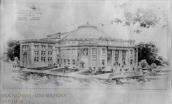 B+W Photograph of Drawn Perspective of Auditorium showing proposed Extension for School of Music, created by Illinois Alum and Architect C.H. Blackall.