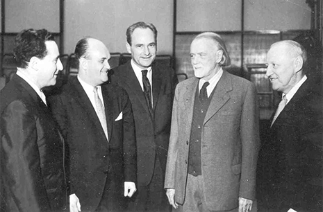 200 dpi black and white photograph. From left to right: Gabriel Magyar, Mihály Kuttner, Dénes Koromzay, Zoltán Kodály, and Zoltán Székely.