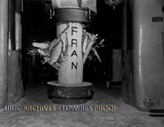 Caption on back: Concrete cyclinder "Fran" bursts under 1,660,000 pounds of force. The cylinder was 20" in diameter by 40" long. Concrete cylinders were smashed every hour for vistors to the Open House. See also 249.