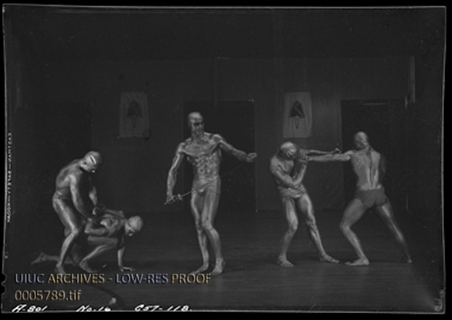 Members of the Gymkana troupe, painted to look like Grecian statues of Olympic athletes, strike athletic poses from wrestling, fencing, and boxing