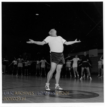 B+W photograph showing Professor Thomas K. Cureton demonstrating breathing exercises to an audience inside Huff Gymnasium