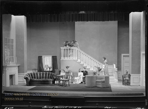 B+W image showing a University production of Bella and Samuel Spewack's 1935 Broadway play, Boy Meets Girl