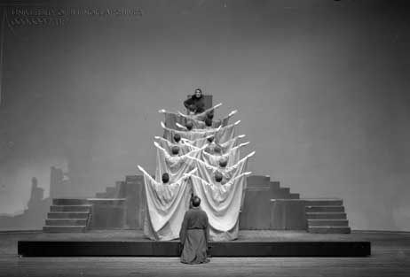 B+W image showing a University production of William Shakespeare's history, Richard III