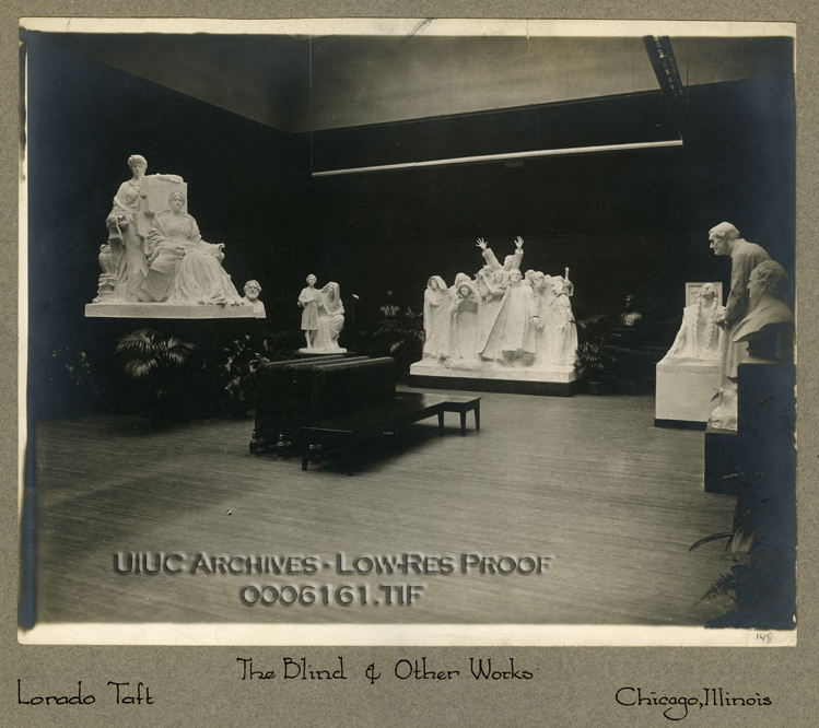 Photograph of Chicago Art Institute exhibit ca. 1907, including Lorado Taft's full-scale plaster model for The Blind and Nellie Vernon Walker's Her Son.