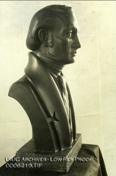 Photo of bust of newspaperman and abolitionist Elijah P. Lovejoy, sculpted by Oskar J.W. Hansen for the Illinois Press Association Editors' Hall of Fame, dedicated in 1930. The bust currently resides in Gregory Hall, University of Illinois at Urbana-Champaign.