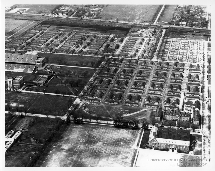 Aerial photograph of Stadium Terrace temporary housing, looking west. Other visible structures include Memorial Stadium at left, and the Men's Residence Halls and Huff Hall at bottom right.