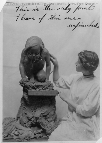 Photo of sculptor Alice Cooper Hubbard of Des Moines, Iowa, and a work in progress. Script on front of photo reads "This is the only print I have of this one - unfinished."
