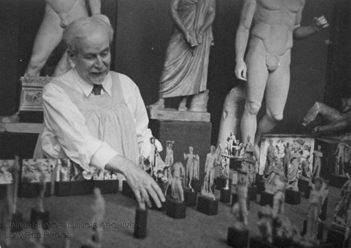 Photograph of sculptor Lorado Taft arranging models on a table.