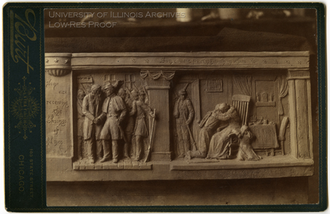 Photo card of a relief by sculptor Lorado Taft, depiciting soldiers leaving for the American Civil War.