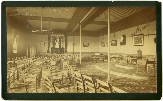 Photograph of a meeting room for the Philomathean Society at the University of Illinois, Urbana-Champaign. Visible on the back wall beneath a proscenium is Lorado Taft's sculpture Excelsior, created for the Society in 1884.