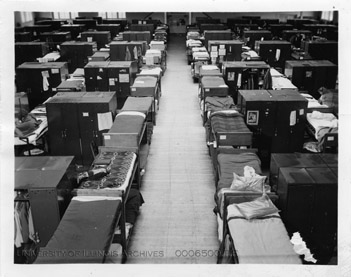 "Three hundred single men live in this unit which was designed as a men's gymnasium. The only space available for the clothing, books, and personal belongings of each man is one of the lockers pictured, 24" x 36" x 78"."