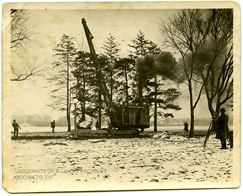 Photograph of a tree being planted on Fourth Street near the military axis, showing in the foreground a crane manufactured by the Osgood Company of Marion, Ohio, looking southeast through the row of Austrian Pines to towards the Stock Pavilion.