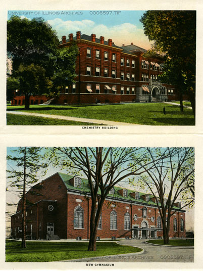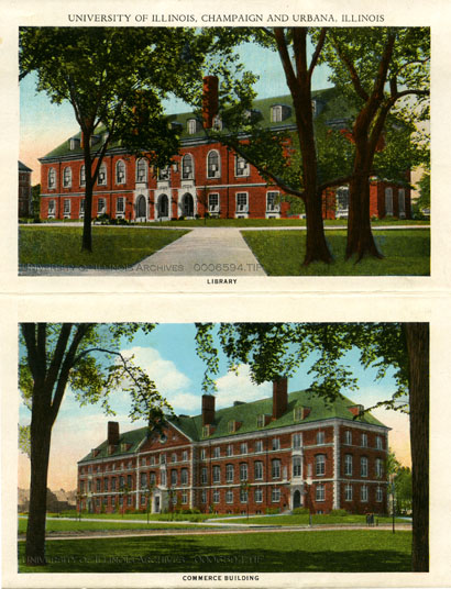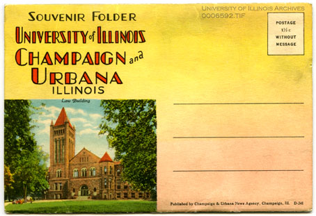 Folder of tinted photographs of buildings and scenes on the University campus as well as in Champaign and Urbana. Buildings depicted include Altgeld Hall, the Main Library, David Kinley Hall, the Armory, the Architecture Building, Henry Administration Building, Foellinger Auditorium, Noyes Laboratory, Huff Hall, the Stock Pavilion, Urbana High School, Lincoln Hall, the Transporation Building, the English Building, the Springer Cultural Center (formerly the Post Office), the old Illinois Central Station, and West Side Park.