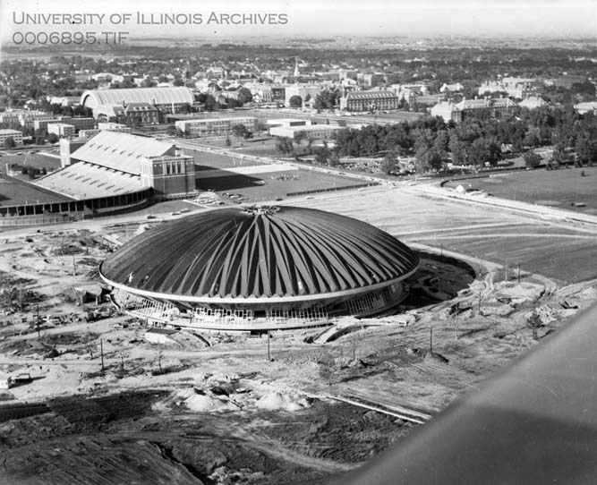 Aerial photograph of Assembly Hall during construction. Visible in the background are other campus buildings including Memorial Stadium and the Armory.