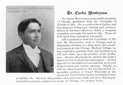 "Dr. Carlos Montezuma, a successful physician of Chicago, graduated from the University of Illinois in 1884. He is a native-born Indian, and has attracted widespread interest and commendation by his brave efforts to obtain a complete education and make his mark in life. These efforts have been eminently successful.
