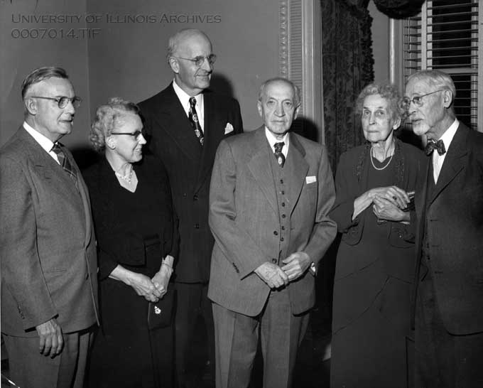 Caption from Champaign-Urbana News-Gazette reads: "RETIRED FACULTY RETURNS. Professors who have retired from the UI college of commerce and business administration faculty were here for the anniversary. Among them left to right, were: Professor A. C. Littleton with Mrs. Littleton, Denver, Colo.; Professor Fred A. Russell, Professor Simon Litman, Urbana; Mrs. M. H. Robinson, Pine Orchard, Conn., whose late husband was on the faculty; and Professor E. L. Bogart, New York city."