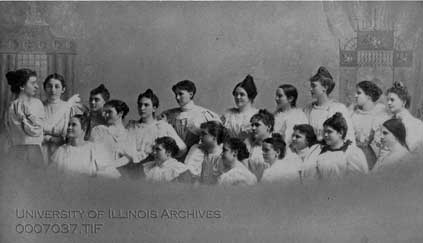 Black and white photograph of the Ladies' Glee Club, as published in the Illio '98 (1897), page 73.