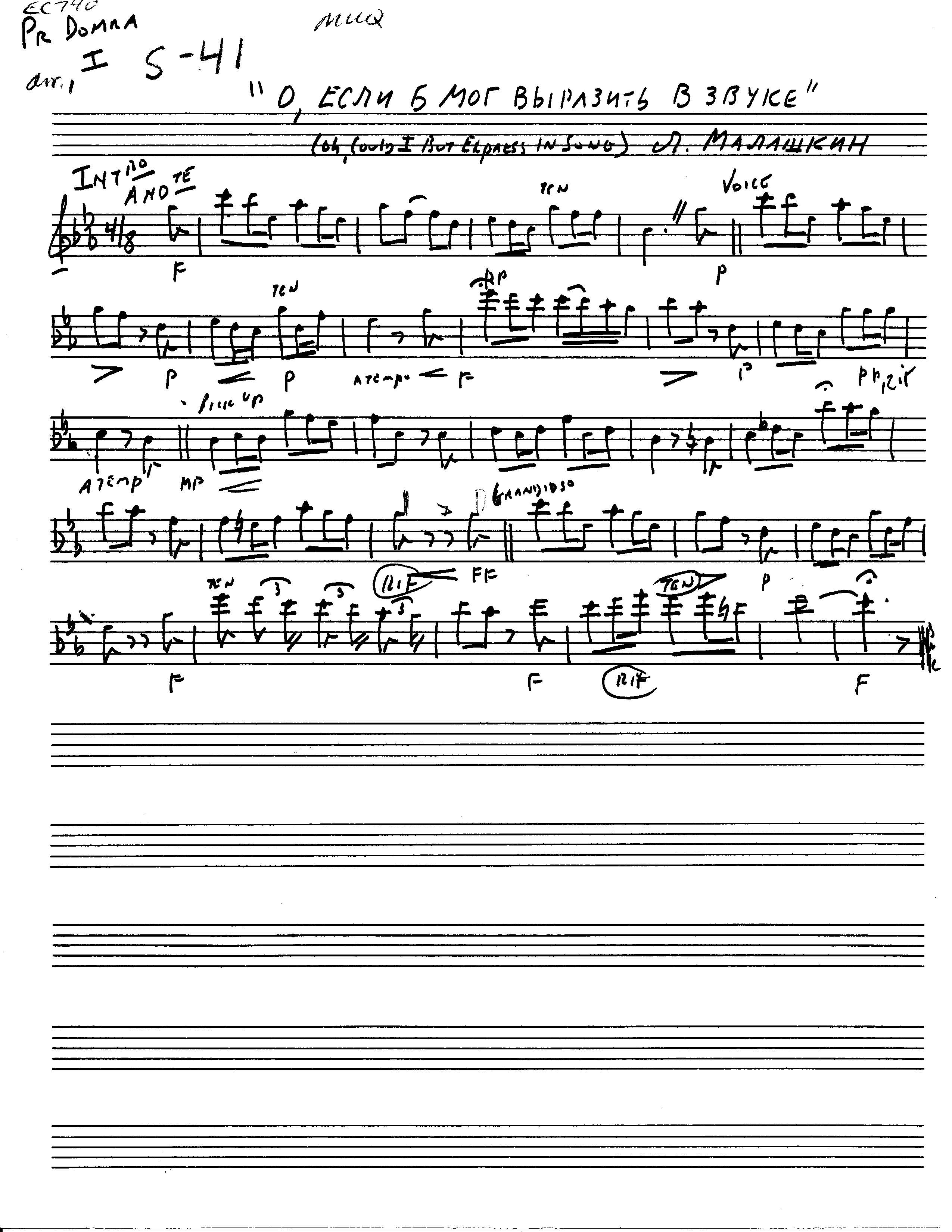 3 scores + 11 parts. Two arrangements as follows: 1. incomplete ms. score and parts for voice and accordion with 10 part Russian folk orchestra (PDI-II, ADI-II, BD, PBI-II, SB, AB, CB), arr. by Kasura; 2. two photocopies of published piano-vocal score with lyrics in Russian (by G. Lishin). For: Conni Moskalenko. English title: Oh, could I but express in song.