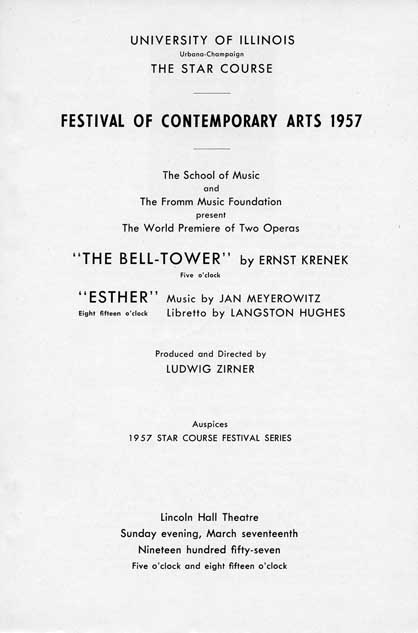 Program for the performance of two operas during the 1957 Festival of Contemporary Arts, Ernst Krenek's The Bell-Tower and Esther, composed by Jan Meyerowitz with a libretto by American author Langston Hughes.