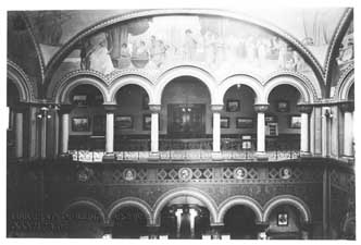 Black and white photograph of the interior "library" of Altgeld Hall. Altgeld Hall was originally known as the Library Building. Intricate murals like the one shown were painted by Newton A. Wells.