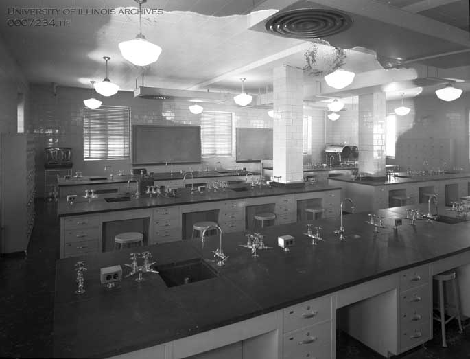 Black and white photograph of the room 412 student laboratory in the Animal Sciences Laboratory. The building was designed by Naess and Murphy in conjunction with University Architect Ernest L. Stouffer, and Sumner S. Sollitt Construction Co. Construction was completed in 1952.
