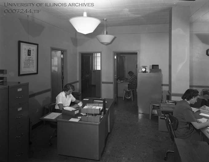 Black and white photograph of women working in the room 315 Dairy Science Office in the Animal Sciences Laboratory. The building was designed by Naess and Murphy in conjunction with University Architect Ernest L. Stouffer, and Sumner S. Sollitt Construction Co. Construction was completed in 1952.