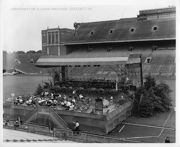 Black and white photograph of commencement stage in stadium field.