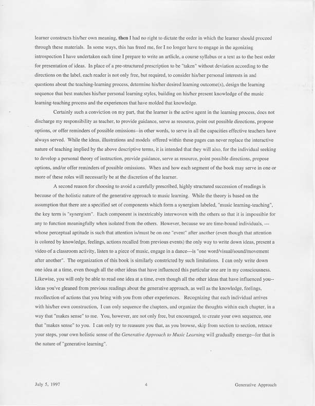 Folder 85: Toward a Theory of Music Instruction: A Generative Approach to Music Learning, unpublished book, 1997