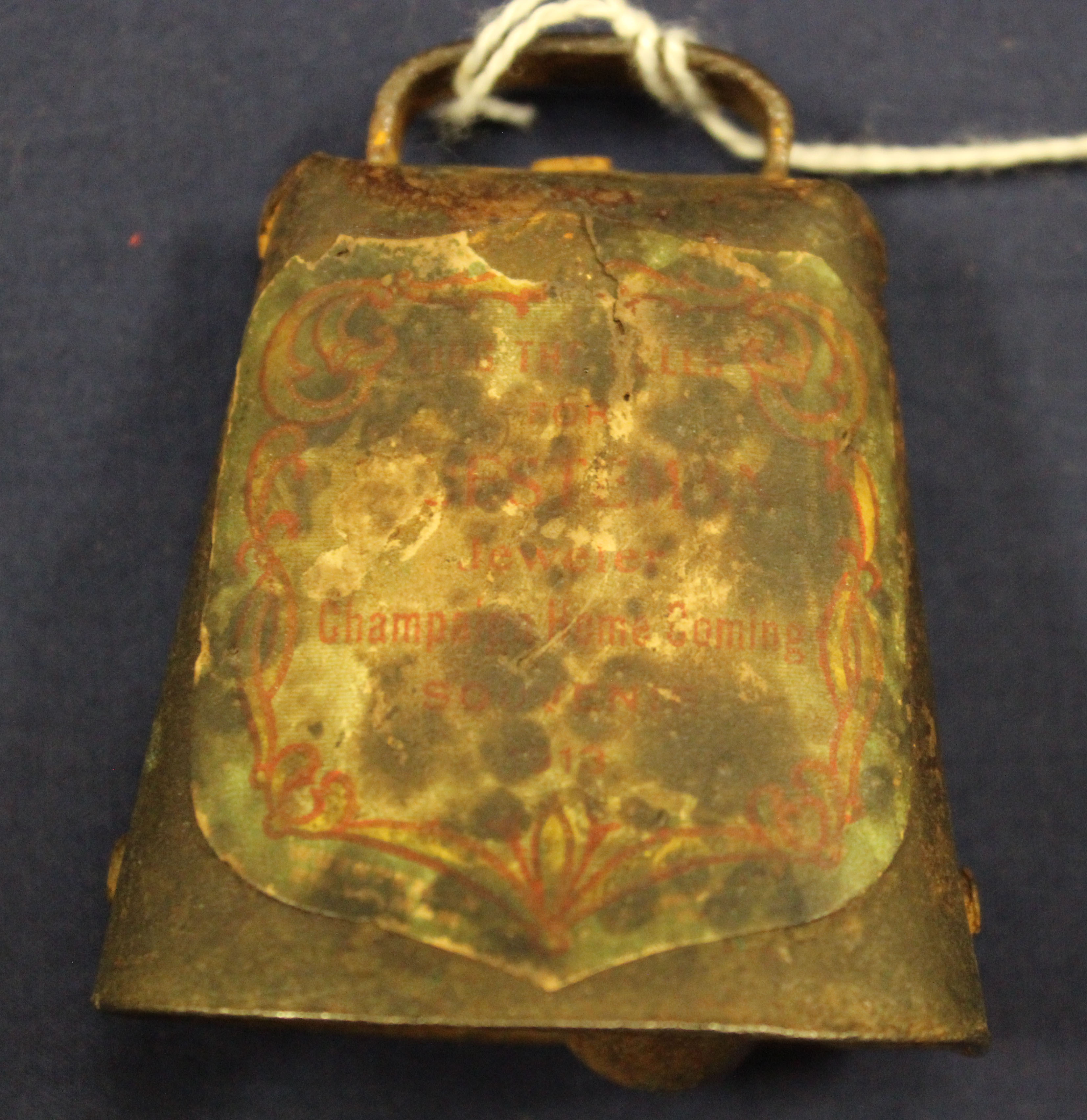 Small cowbell as a Homecoming souvenir. Contains the label "Ring the bell for...Esteman Jeweler..." From RS 16/1/21.